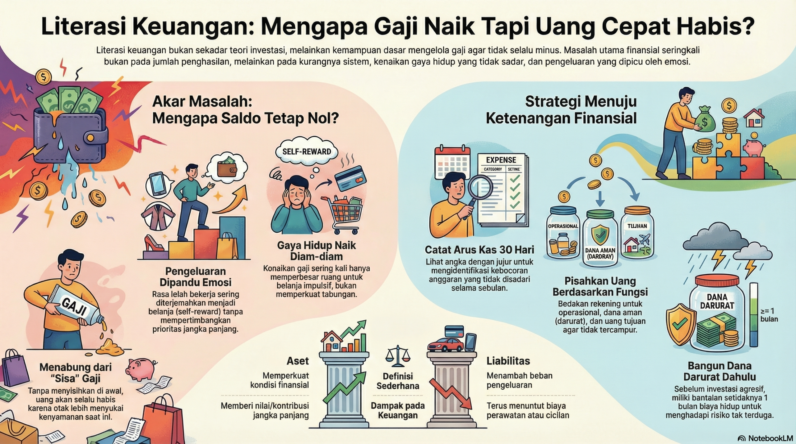 Pada akhirnya, literasi keuangan bukan tentang menjadi orang yang paling tahu istilah finansial. Ia lebih dekat pada kemampuan untuk tidak terus-menerus hidup dalam kebingungan setiap kali gaji masuk dan kemudian menghilang begitu saja.