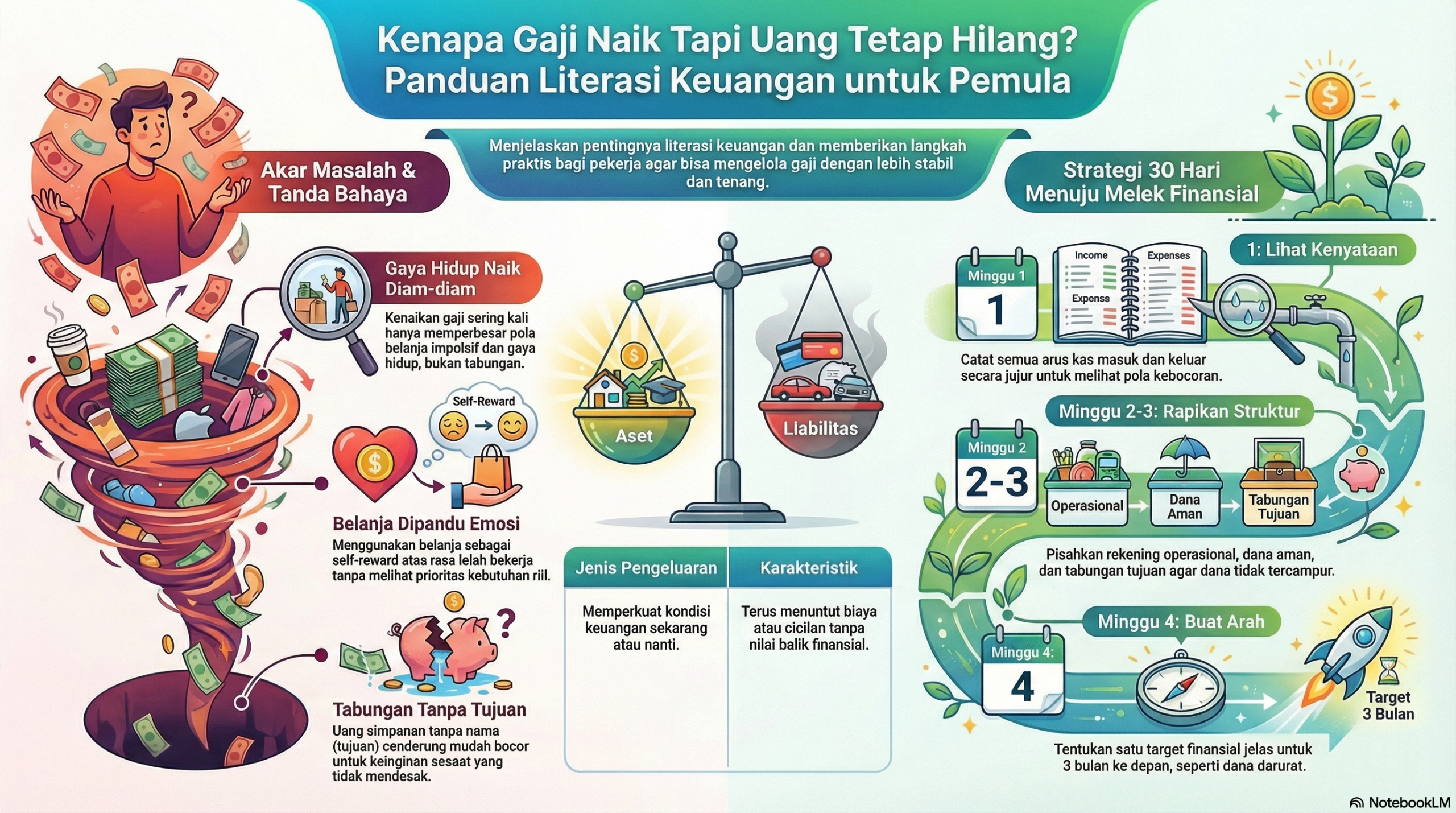 - Gaji yang naik tidak otomatis membuat kondisi finansial membaik jika gaya hidup dan komitmen tetap ikut naik.
