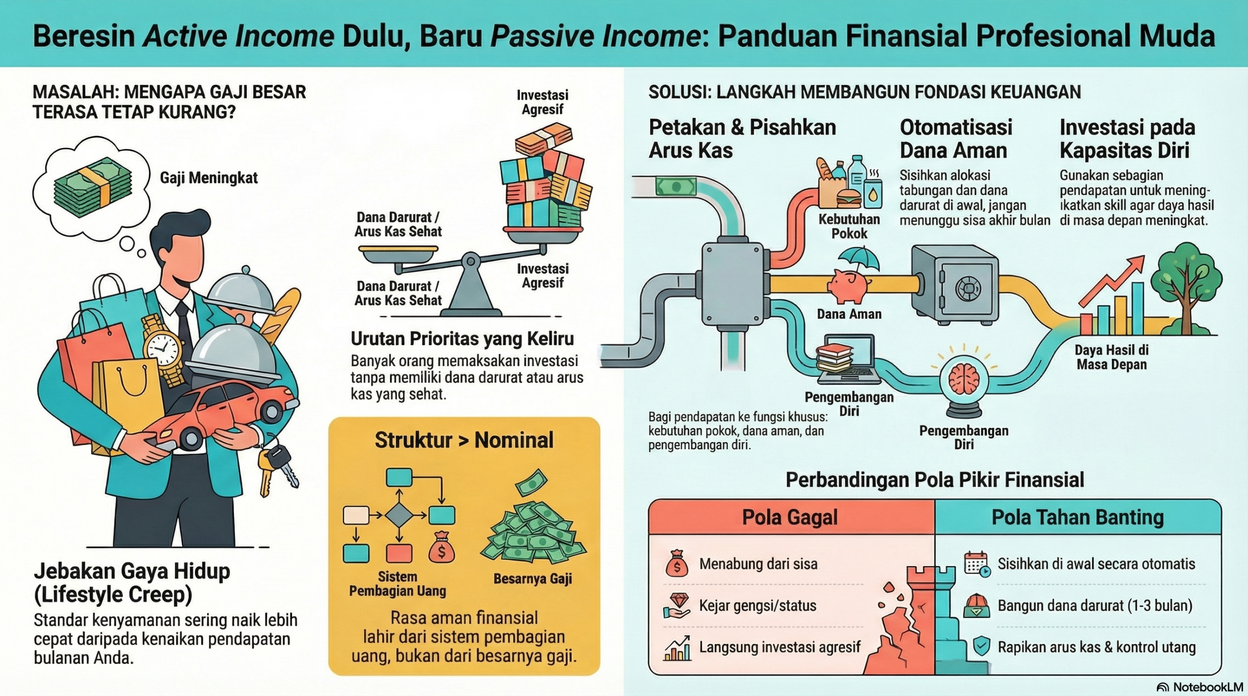 Banyak orang salah karena membayangkan passive income sebagai jalan keluar dari kekacauan active income. Padahal kalau active income masih berantakan, passive income justru berisiko menjadi proyek yang dipaksakan, menambah stres, atau membuat salah ambil keputusan.