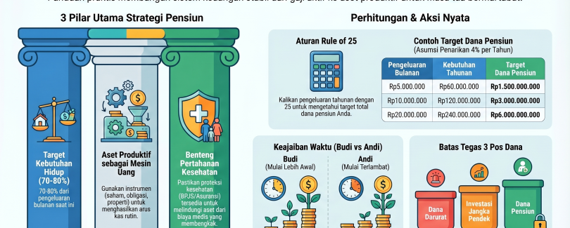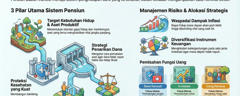 Banyak orang membayangkan pensiun sebagai satu angka besar. Seolah-olah jika suatu hari sudah terkumpul nominal tertentu, maka semua urusan selesai. Padahal pensiun yang sehat bukan sekadar soal berapa uang yang ada, melainkan soal bagaimana kehidupan tetap berjalan ketika penghasilan aktif tidak lagi sekuat sekarang. Dalam arti yang lebih dewasa, pensiun …